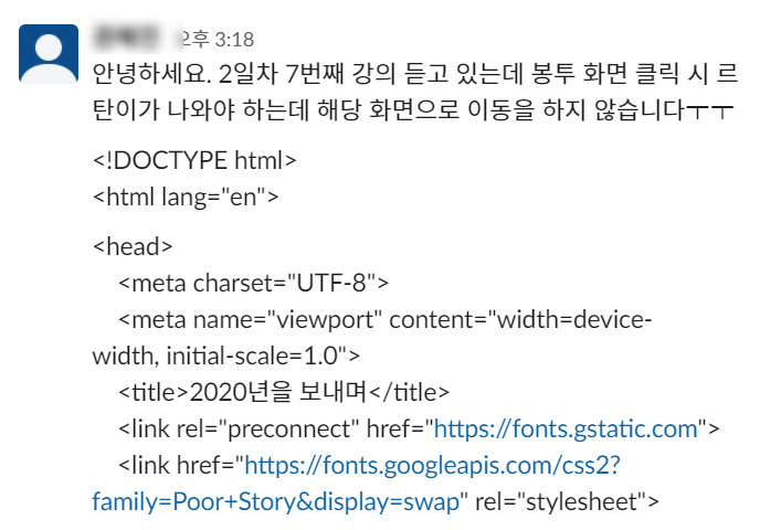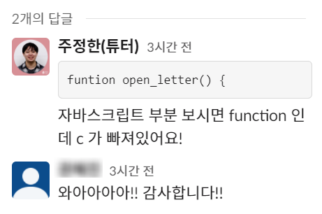 강의를 따라가다가 막힐 때 슬랙으로 질문하면 바로바로 튜터님들이 답을 해줘서 정말 좋았다.